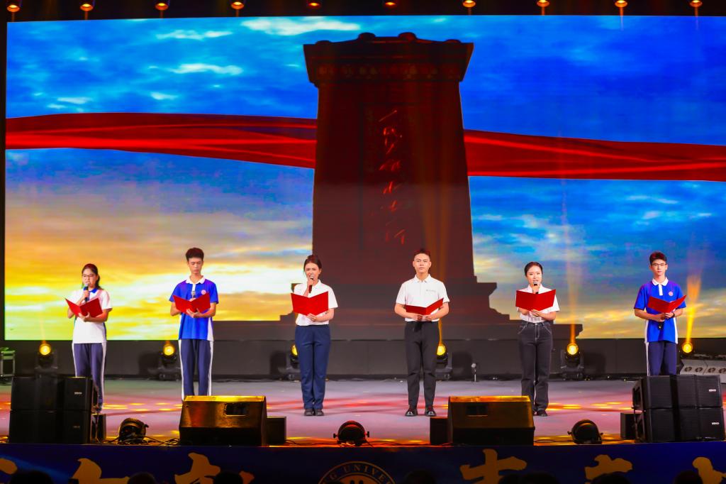 The curtain rose. A thematic recital, "The Mountains and Rivers Will Not Forget, History Will Not Forget, The People Will Not Forget," was passionately presented by representatives of teachers and students from PKU SZ, the Affiliated High School of Peking University, Shenzhen, and Xili Primary School. As the stage lights brightened, images of a monument appeared on screen, a red ribbon unfurled, a trumpeter played a stirring melody, and six reciters stood in formation. Their powerful, modulated voices, filled with remembrance and respect for revolutionary martyrs, ignited a sense of national pride among the audience, drawing prolonged applause and setting a solemn yet stirring tone for the evening.